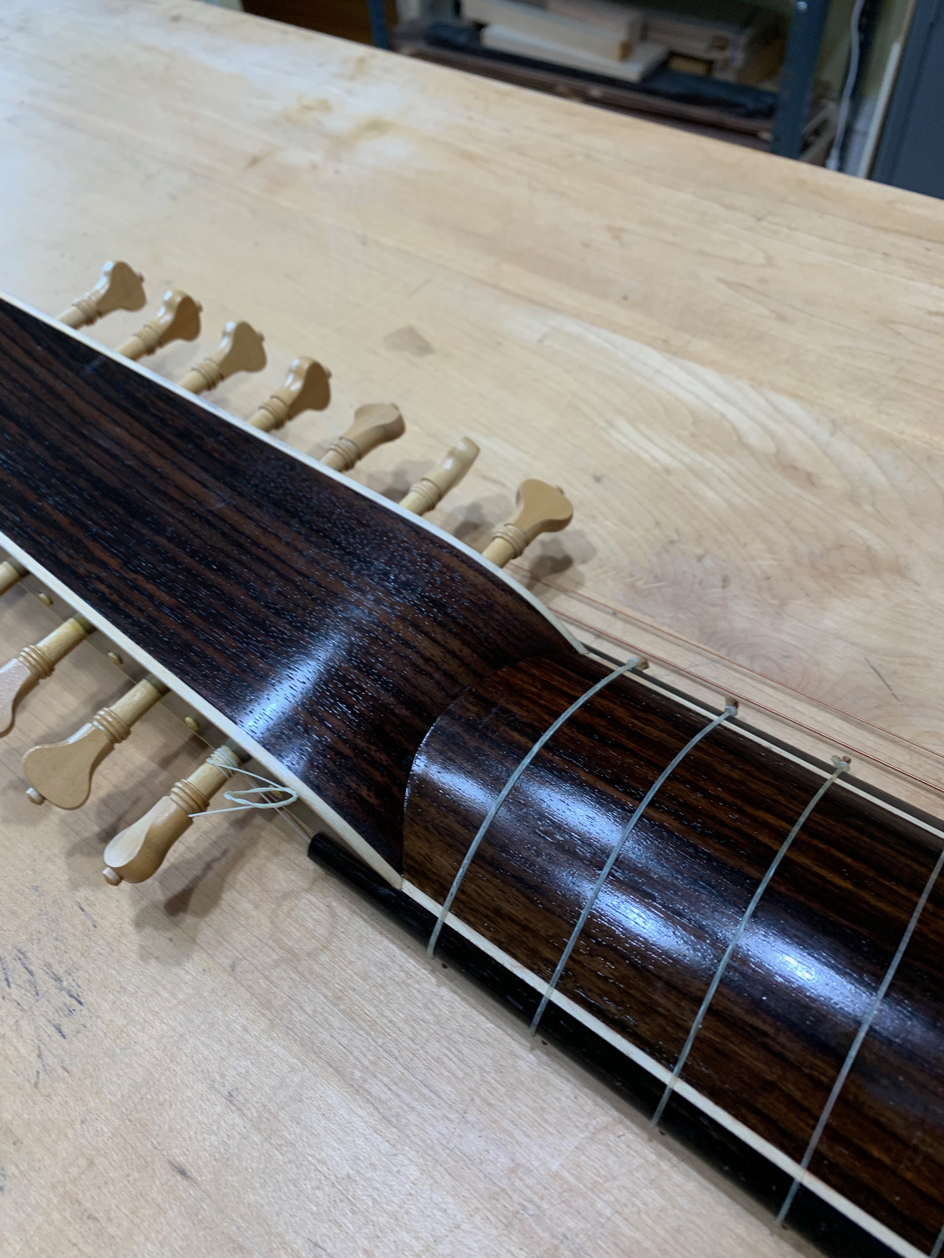 There is a beautiful crumpled (silk?) lace around the edge of the bowl that obscures the neck joint. My guess is that the joint is an abrupt butt joint rather than the earlier medieval style of the bowl's ribs blending into the neck stock. There are two openings in the belly. The central rose is composed of three layers probably assembled from parchment and wood similar in design to known early baroque era roses. A second sound hole in the shape of a lancet window, often referred to as a fenster is positioned at the top of the belly and appears to be constructed of parchment and wood. Two inlays are positioned on each side of the rose.